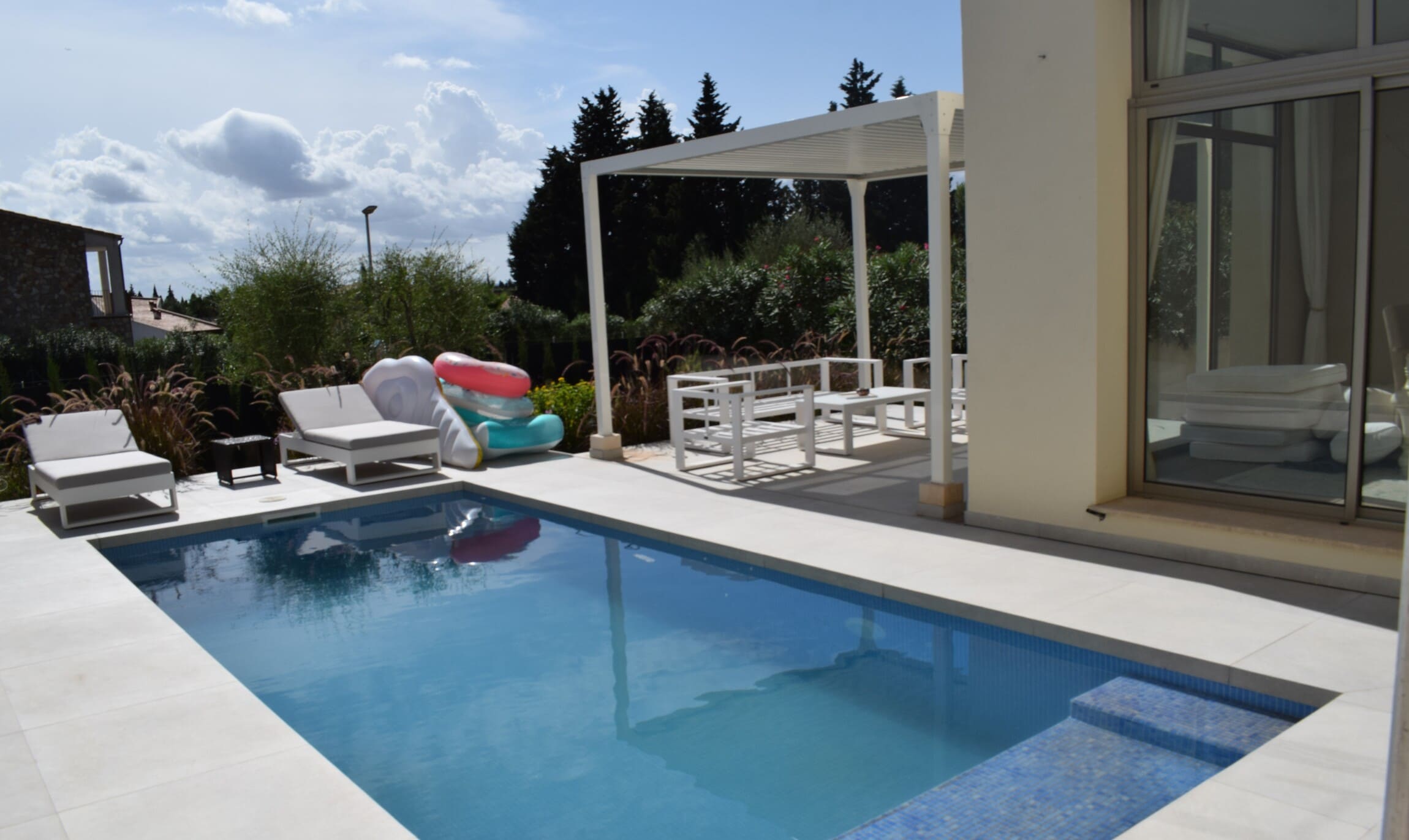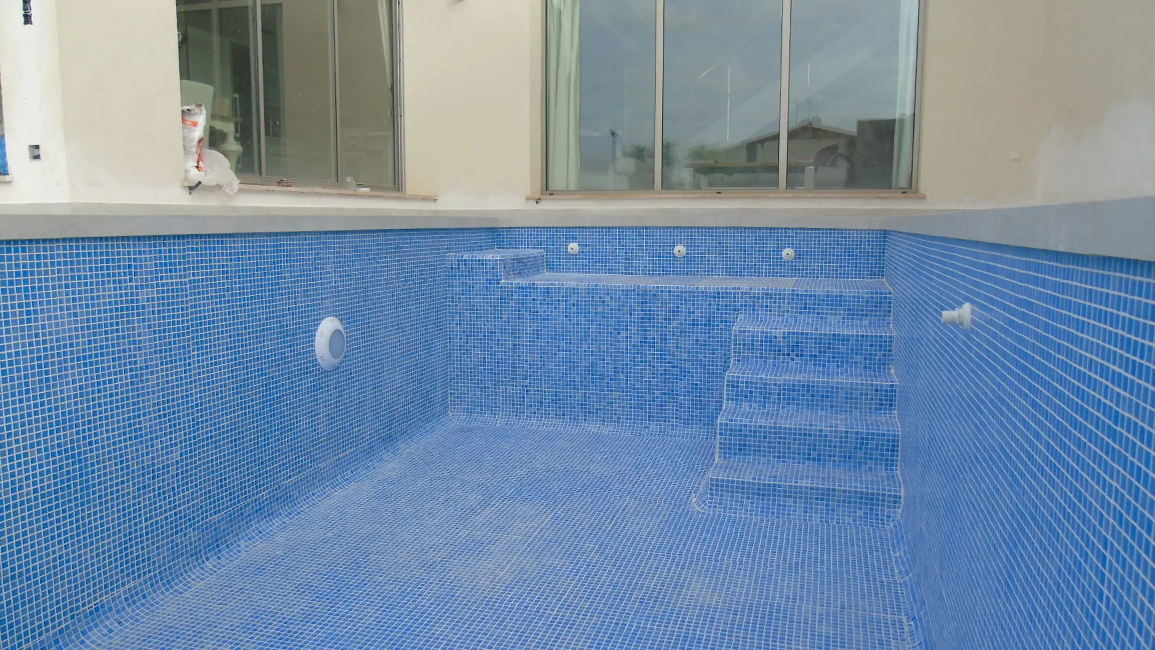 Se construyó una piscina de obra con acabado en gresite claro, borde rebosante y sistema de filtración silencioso y eficiente.